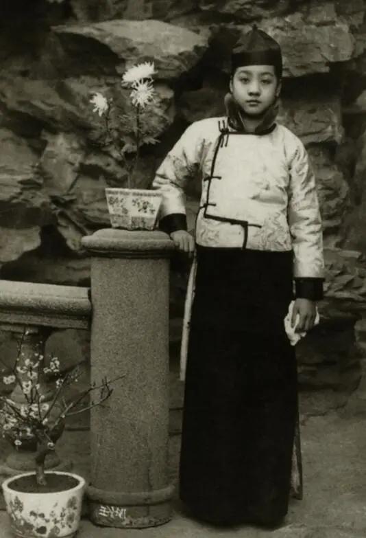 清末民初流行女尚男装,满族王府中有不少女眷身着男装出现在各种公共场合。照片中女子头戴瓜皮小帽,身穿“缺襟马褂”,俨然一美少年形象。