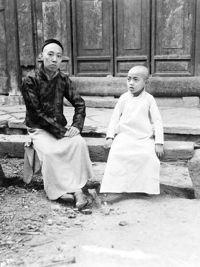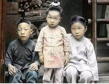 三个小孩,穿的衣服比较好,可是表情是不是很别扭。这张照片是通过现代技术上色的。