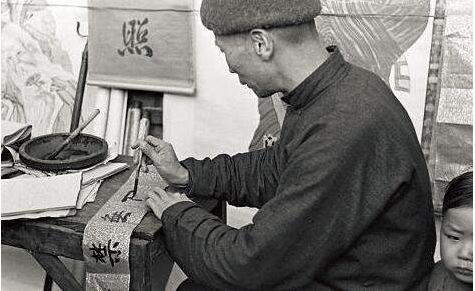 民国时期,街头书法家使用毛笔写春联。春联,是雅俗共赏的独特文学形式,它历史悠久,应用广泛,是祖国文学遗产中的瑰宝。
