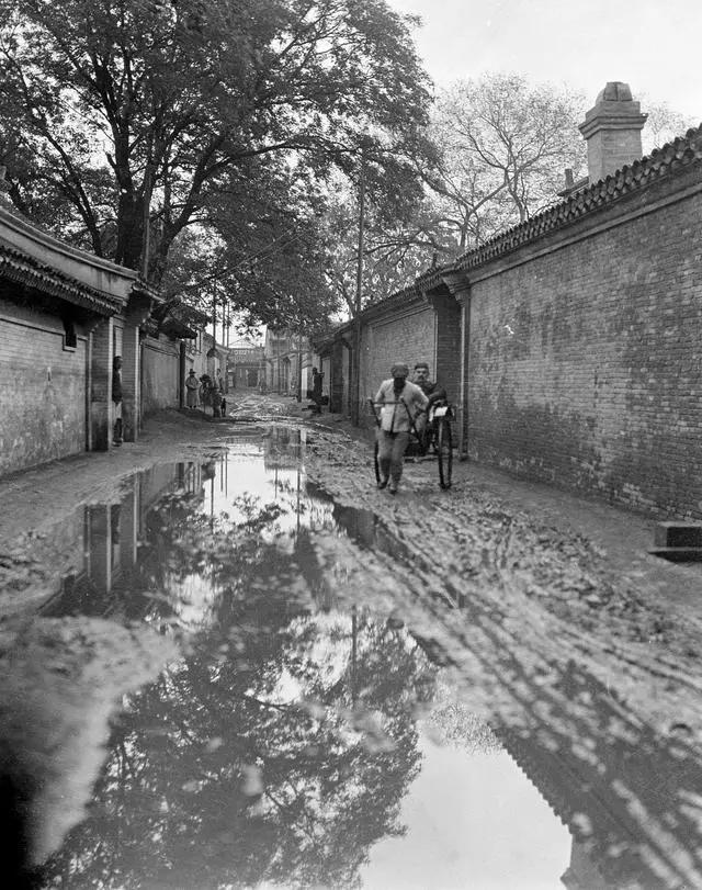 图为北京一胡同,一到下雨天泥泞不堪,富家翁乘坐人力车出行。那个年代的经济结构是典型的金字塔结构,社会底层的人收入低下,越往底层人越多,黄包车夫一个月只能挣到2块大洋左右。只够吃两顿全聚德烤鸭。