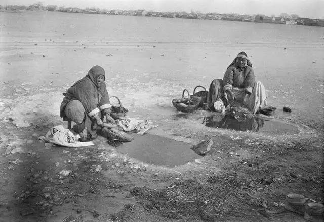 中国自近代以来,多灾多难,外有帝国主义侵略,内部反封建求民主的道路也异常艰难,是中国历史上最黑暗的一段,尤其是从光绪二十六年到民国十三年,物价飞涨,人民生活困苦不堪。图为寒冬腊月在永定河上洗衣服的农妇。