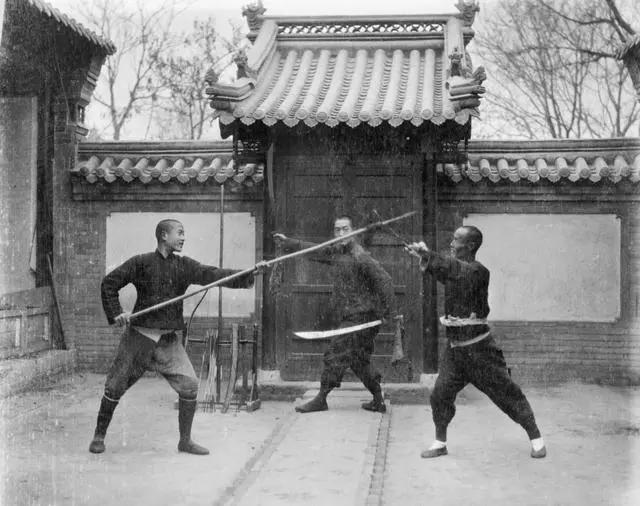 那个社会是动乱的年代,给镖局的发展提供了土壤,清朝灭亡后,驿站都取缔了,许多交通要道都有土匪,因此保镖业务的需求量大增。图为镖局内操练武艺的镖师们。