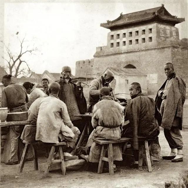 【北京德胜门前的粥铺】一群青壮年围在粥铺前享受“大餐”。