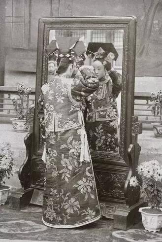 一位旗人女子在镜子前打理头饰