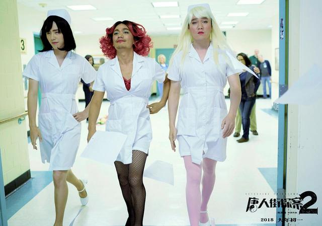 既然影片定位如此,演员们在片中也就愈发放飞自我。妻夫木聪率先贡献性感照片吸睛,之后王宝强、刘昊然、肖央等主演更是不遑多让,先是纽约麦迪逊大道上裸奔,接着易装成性感销魂的护士闯入医院偷查资料,后又驾着马车大闹时代广场……真真是高能不断,尤其是王宝强牺牲最大,裸奔时仅穿一条三角红内裤,后来三人误入朋克壮汉主题的GAY吧,他更是被口衔红玫瑰的吧主爱怜地高高抱起共舞一曲《粉红色的回忆》,喜剧笑果绝对能令人喷饭!