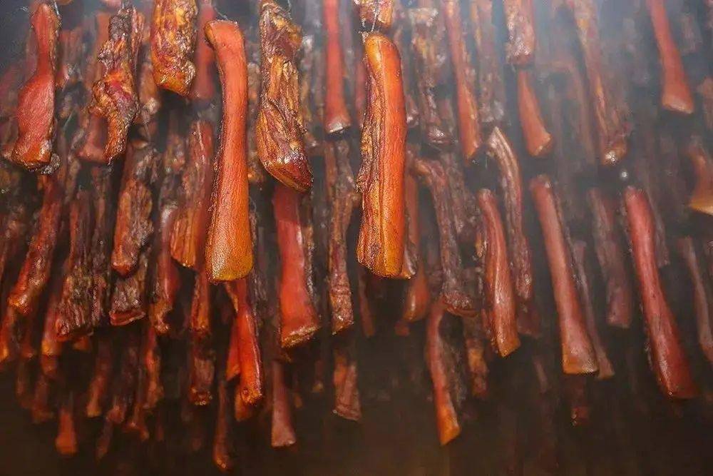 而且湘西腊肉必须要经过烟熏,暗火燃着茶壳、橘皮、松果、谷糠、柏叶等,一共要青烟袅袅地熏上七八天,再吊在民居里数个月,腊肉才能真正成型入味。