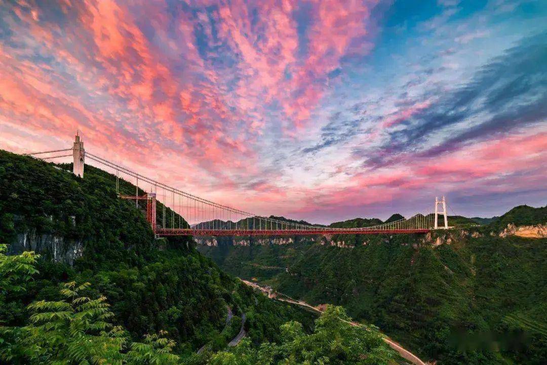 德夯大峡谷中,一座世所罕见的特大悬索桥,凌空飞架于大峡谷之上,犹如一条钢铁巨龙横卧在山间,这个不普通的天空之桥直接拿下了四个世界第一。