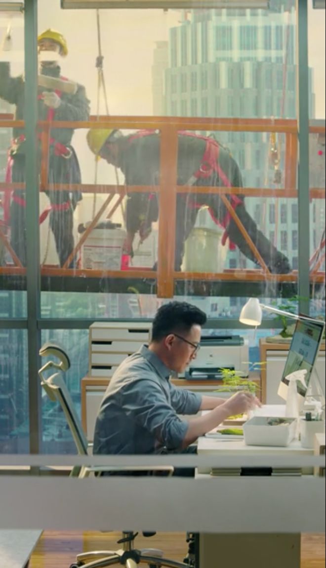 就以2月3日登场的《谢谢你》为例,主要场景就是一个办公桌,横向是窄幅,而纵向则大有文章。首先就是高大的落地窗,细又窄的画面尽收其中,窗外升降机出现,上面擦玻璃的蜘蛛人,与窗内办公桌上的白领形成了高低上的落差。而该片作为第三人称视角(与第三部《温暖你》的第一人称主视角还不同),视角在窗内窗外两位角色身上切换,从而形成了俯视/仰视的不同视角落差。