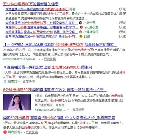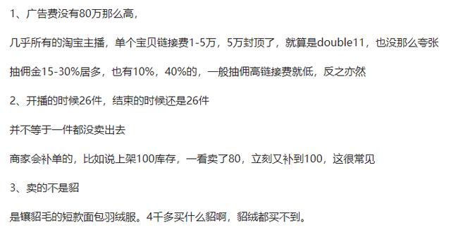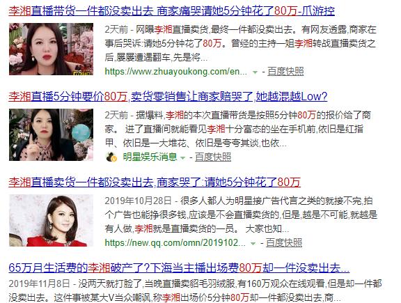 “淘宝直播带货,5分钟报价广告费80万,一件都没卖出去。”、“李湘直播卖貂,开始卖的时候库存26件,直播结束还是26件。”。。。