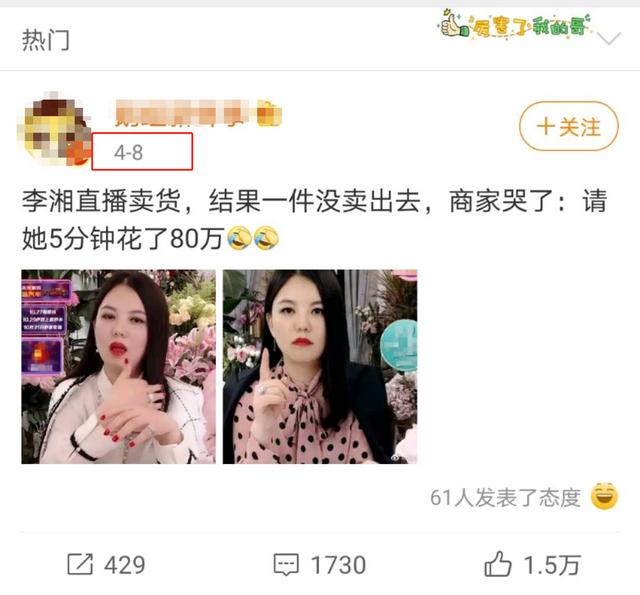 等等诸如此类的,也引发了不少热议。为此笔者还特意留意了一下时间,是4月8日开始。近期老罗、小朱等明星直播带货频上热搜的同时,李湘直播带货翻车的帖子在其中无疑格外醒目。