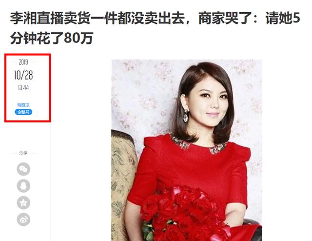 原因很简单,关于李湘“80万广告费”、“一件没有卖出去”的传言,是去年10月的文章,而且是已经被辟谣的。网友们可以看下时间,这样的文章,最早是在2019年10月就出现了。