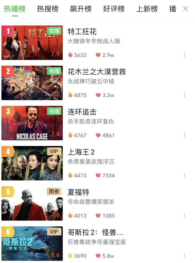 可见,这部电影借着女性动作电影时下正火东风的作品《特工狂花》,火爆又刺激,养眼又养神,真的是不负“狂花”美名,难怪该片在爱奇艺上线之后,播放量稳坐爱奇艺电影榜第一位的宝座,更是达到爱奇艺总榜第四位的位置。