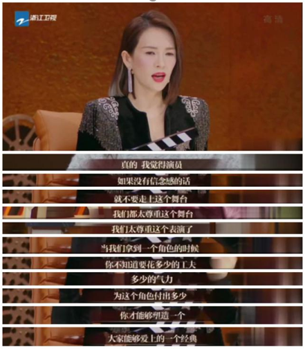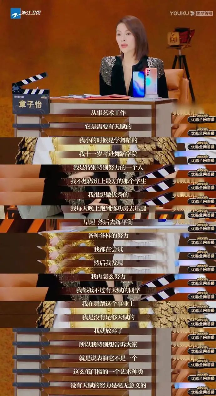 因为热爱和敬畏,所以看到有些演员,对表演没有敬畏感,她会发脾气,会心急,她感叹“做演员确实不难,想演好戏真的很难”,就像上一期,盛一伦和张楠表演《香蜜沉沉烬如霜》的高光片段,然而他们的表演太过流于表面,章子怡表示他们二人还不具备演员最基础的七力四感,第一感就是真实感,他们只是把台词背了,传达出来的东西很空洞,表演不是一个低门槛的艺术种类,没有天赋的努力是毫无意义的。”