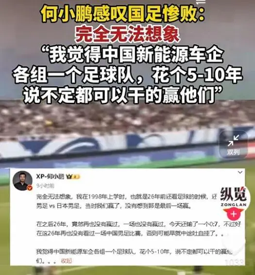 何小鹏批评道,给新能源车企十年,说不定就能组队打赢日本。