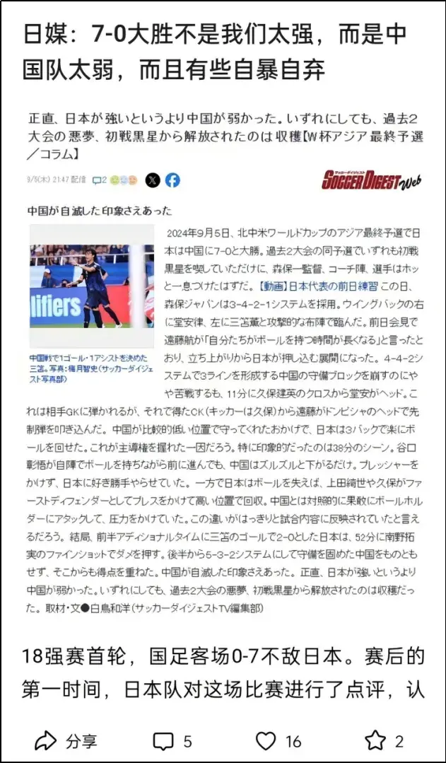 日媒直言不讳地说中国队太弱了,有些自暴自弃。
