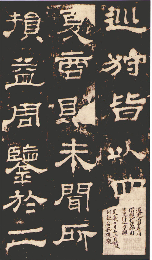 清杨守敬评:“是碑隶法实佳,翁覃溪(翁方纲)云:‘骨肉匀适,情文流畅。’诚非溢美,但其波磔已开唐人庸俗一路。”这正讲出了该碑的微妙处。临写此碑要特别注意波画的“逆入平出”,尤其是起笔处的逆势不能形迹外露。如“蚕头”的逆势形迹向上作侧锋外露,就流于了唐隶“蚕头”起笔侧露的庸俗风气。