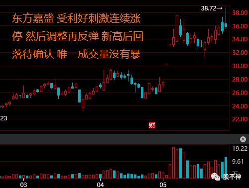 比如东方嘉盛,该股之前受利好刺激连续涨停,然后开始调整,调整过程中没有大量出货也没有大量买入,然后一个小反弹看起来还是没有主力买入。直到前高点出现一次高开涨停,但涨停很快打开大幅回落。新高涨停打开大幅回落,解释:主力利用反弹出货,:拉升前的试盘。鉴于涨停打开回落幅度较大,虽然成交量没有暴出来,但两种可能性都存在,需要看后市进一步确认。