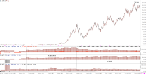 2. 成熟期的企业,它们的主要任务是“把利润做大”,用利润和分红回馈股东是一家成熟的优秀企业的基本素质。这一时期的主要特征是:权益收入率和权益毛利率较成长期有所下滑,但此时的权益净利率逐渐攀升达到较高水平。一旦出现权益净利率出现向下拐点,大概率上这家企业的竞争力和市场地位正在遭受外部侵蚀,将进入衰退期。