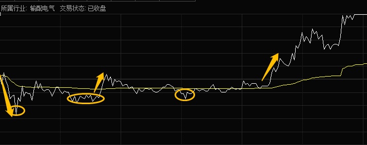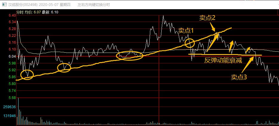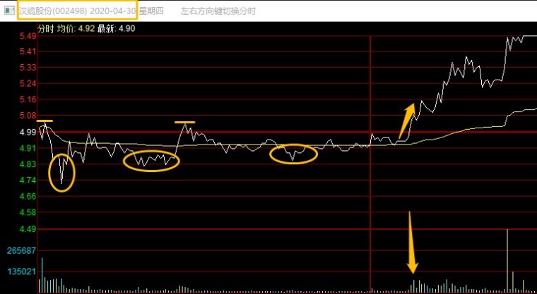 这是汉缆股份4.30的分时走势,这种形态就是典型的分时低点承接不破,通常是开盘有一个明显下跌或者拉升之后,在震荡的期间,走出这种形态,后面分时放量拉升,突破当天分时高点就是确定性买点。这种情况,我建议没有丰富经历的兄弟不要急,一定要买在确定性,不能只图位置低。确定性也是因人而异。但如果你着急了,对了还好,一旦错了,下面这个情况可能就是下场: