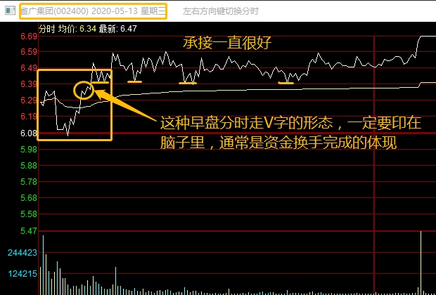 这是省广集团5.13的分时走势,这种分时V字的走势很具有代表性,像图一4.30汉缆股份那种,其实就是加长版的\____/,而省广这种就是普通的V.图上标注的很清晰,我就是在那个确定性买点出手的,后面承接一直很好,直到午后直接拉涨停。