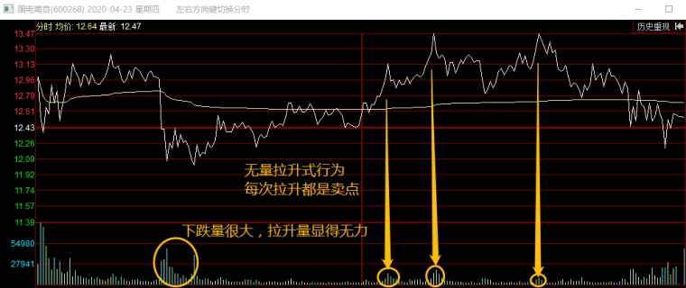 这是国电南自4.23的分时走势,下午的几波拉升明显没有放量,这个量跟谁去比,跟前面的量对比,要大于至少也要等于前面拉升或下砸的量。显然他是不符合这种情况的,所以我说这种无量拉升的都是耍流氓行为,赤裸裸的骗人去接盘,如果这一点你能看出来,那么大多数分时的坑你都会躲得过。这是从放量缩量来看,从突破最高价的确定性买点来看,当然这个确定性主观上是因人而异的,但是这并不妨碍客观上有个最确定的买点,看下面这个案例。