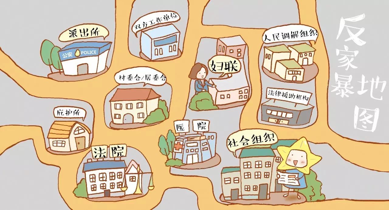 《反家暴法》出台后,李莹所在的机构绘制了一份「反家暴地图」,指出公安机关、居(村)委会、妇女联合会、加害人或者受害人所在单位都可以作为求助机构。法律规定这些单位接到家庭暴力投诉、反映或者求助后,「应当给予处理、帮助」。