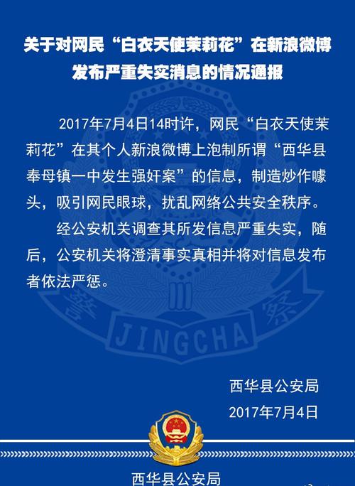 7月4日晚,西华县公安局发布微博称,7月4日下午,有网友在微博上发布“西华县奉母镇一中发生强奸案”的信息,制作炒作噱头,吸引网民眼球,扰乱网络公共安全秩序。经公安机关调查其所发布信息严重失实,随后,公安机关将澄清事实并将对信息发布者依法严惩。