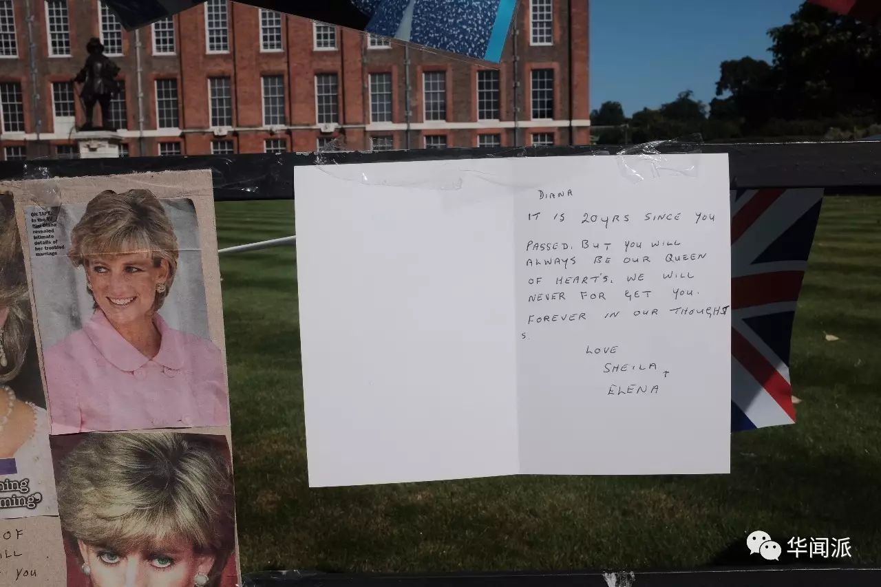 ▲还有人留下了卡片,上面写道:“戴安娜,已经过去20年了,但你仍然是我们心中的王妃。我们永远不会忘记你,你永远活在我们心中——爱你的,Sheila和Elena”