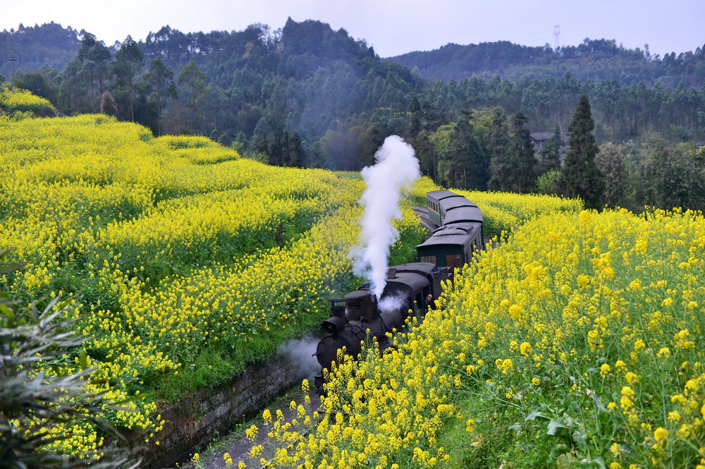 小火车途经菜子坝和亮水沱站,停了下来,放乘客下车登高观望火车蒸汽秀:小火车喘着粗气,哐哧哐哧的退回到金黄的油菜花地深处,再呜呜呜呜的喷着白汽从弯道尽头出现,分花拂柳,轰鸣而来。这是一趟从遥远的年代开来的,满载怀旧故事的列车。