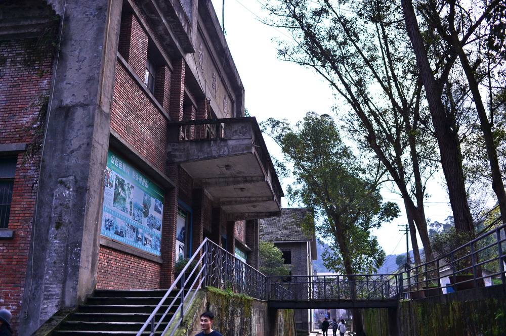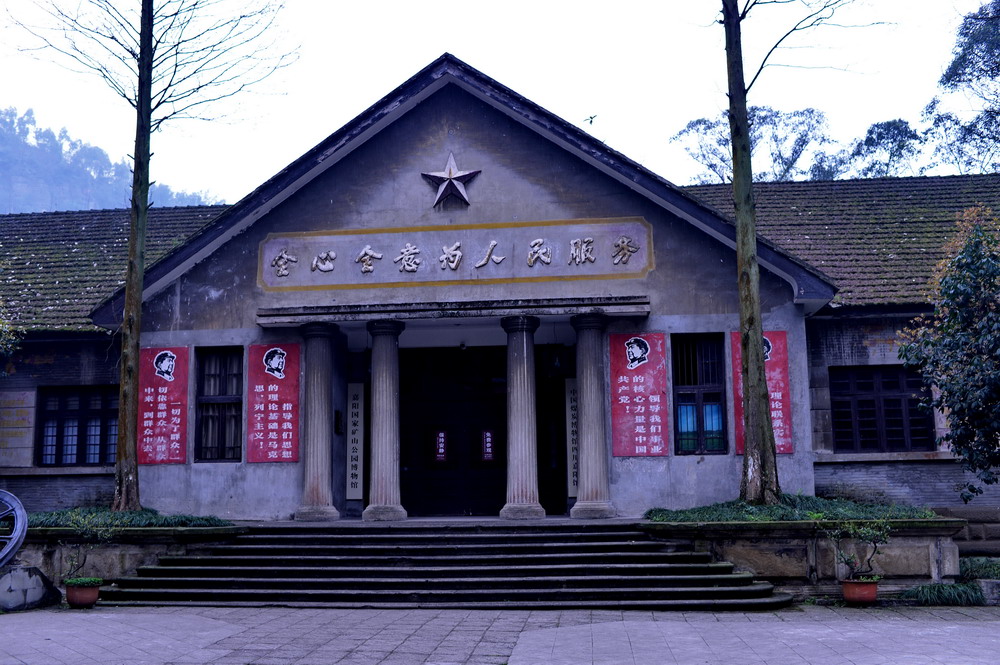 沿芭沟车站旁的石阶下去,两侧是依山坡而建的一排排矿工宿舍,高大的梧桐树下,苏式的、英式的小楼掩映在树荫里,一座看似当年的煤矿办公楼,门框上用水泥雕刻着五角星及“全心全意为人民服务”五个大字,现在是嘉阳煤炭博物馆;对面体量最大的苏式大会堂,便是小镇的中心;会堂一侧是东方红广场,目测有一个加大的足球场那么大,可见当年嘉阳煤矿鼎盛时期人数之多。