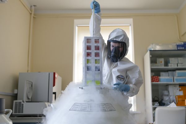 8月6日,在位于俄罗斯首都莫斯科的“加马列亚”流行病与微生物学国家研究中心,研究人员在实验室内工作。(新华社)
