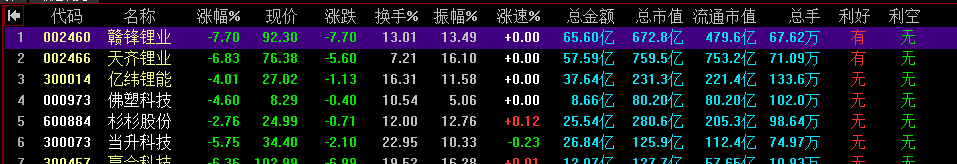 作为新能源概念股灵魂人气龙头,午后跳水也引发羊群效应。带动当升科技、杉杉股份、赣锋锂业、天齐锂业、道氏技术等个股更是出现大幅下跌。