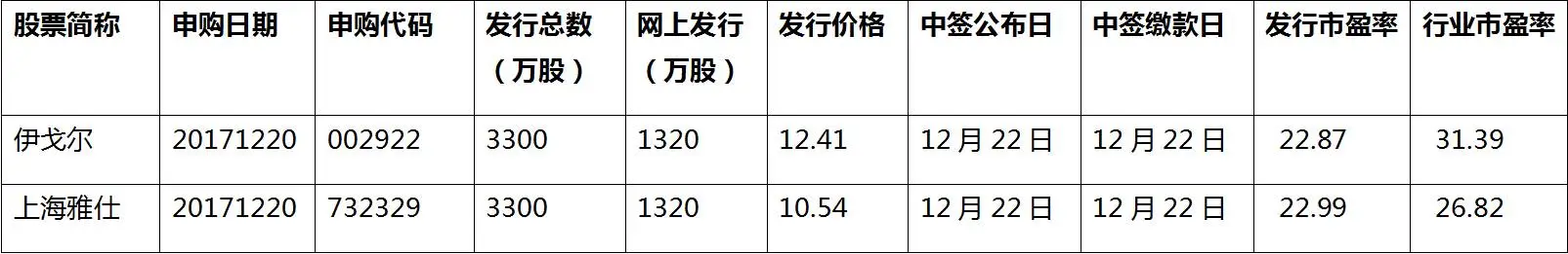 2017年12月20日,有2只新股申购,分别是伊戈尔和上海雅仕。