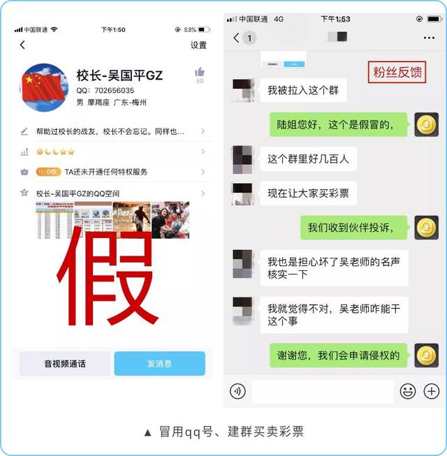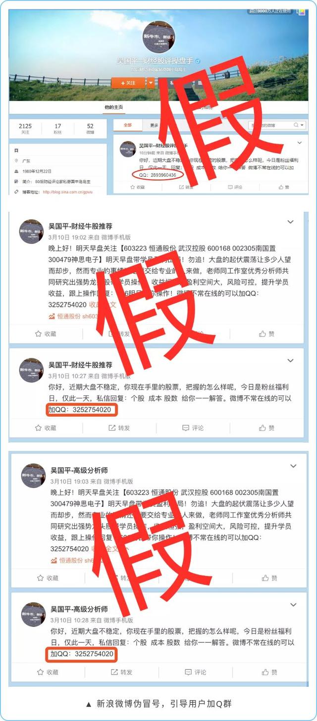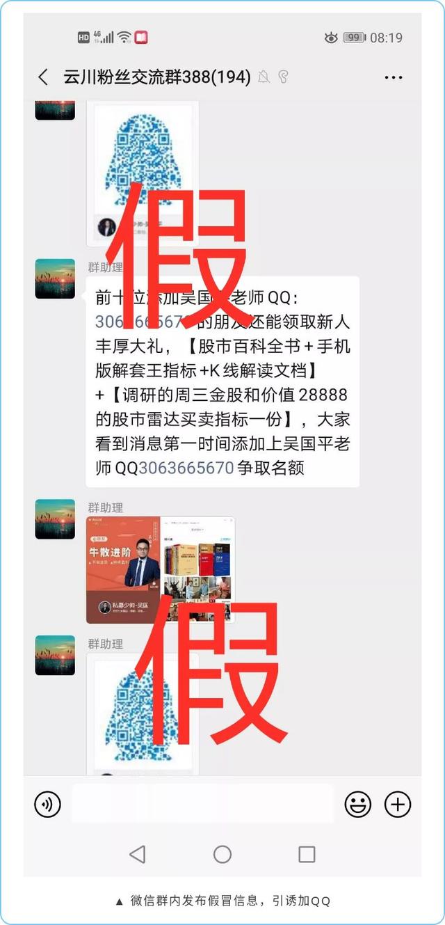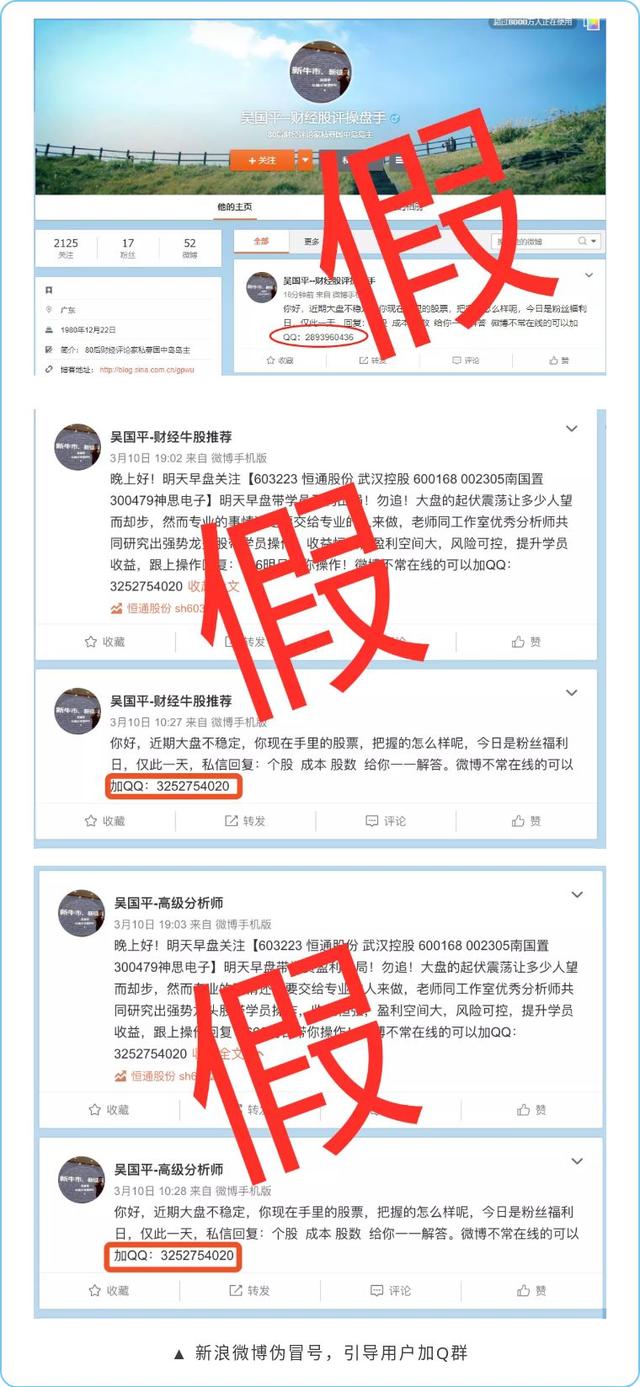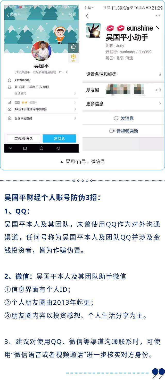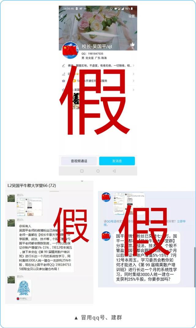 其中冒用名义包括并不限于“吴国平”、“吴国平财经”、“吴国平小助手”、“吴国平-牛散大学堂”等,假冒渠道包括但不限于电话、短信、网络直播、微信、QQ等。更有团伙伪冒吴国平在QQ等平台发起大额买卖彩票等违规行为!(大家遇到转账交易的情况,记得务必核查对方身份,方法之一就是与对方视频通话核查身份。)
