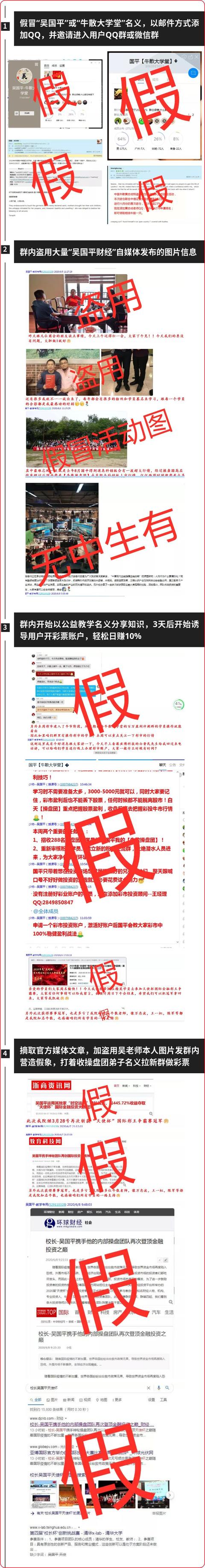 近期,我们陆续收到用户反馈,发现多起未经我方允许、授权,伪冒“吴国平”、“牛散大学堂”等名义,盗用吴国平个人肖像,进行系列性违规犯法行为。