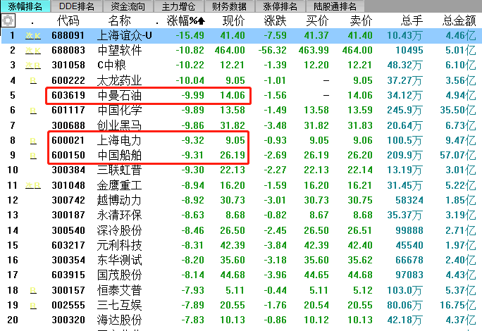 与此同时,它们强势的过程当中,其实蛮多的板块都出现了调整,有些个股还出现了明显的杀跌,尤其是前期有一定上涨的或者是题材短期炒完之后退潮的,你看跌幅榜前列的上海电力、中国船舶、中曼石油,很多都是类似这样的状态,包括创业黑马,都是跌幅蛮多的,七八个点,甚至十几个点都有,今天指数逼近年初的新高,但是事实上今天的大部分个股是下跌了。