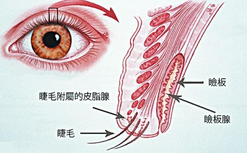 霰粒肿长在靠近眼睑缘的睑板腺(图一)上,西医称为睑板腺囊肿,中医称为胞生痰核。实际上就是眼皮内出现了囊性包裹的圆形实质性病变(图二)。囊内的物质本该是往眼睛表面分泌的脂质状液体,由于分泌口堵上了,液体排不出来,堵在那里了。因为眼皮实在很薄,积在两层眼皮之间的液体在眼皮内到处流动可就出大事了,于是身体的保护机制开始运转,自已缝了个囊将液体包起来,不让它再流到别处去捣乱。