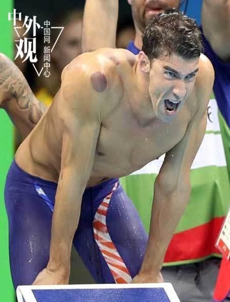 游泳名将菲尔普斯在里约奥运会比赛时,拔罐帮助他拿了金牌。