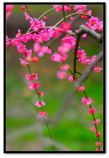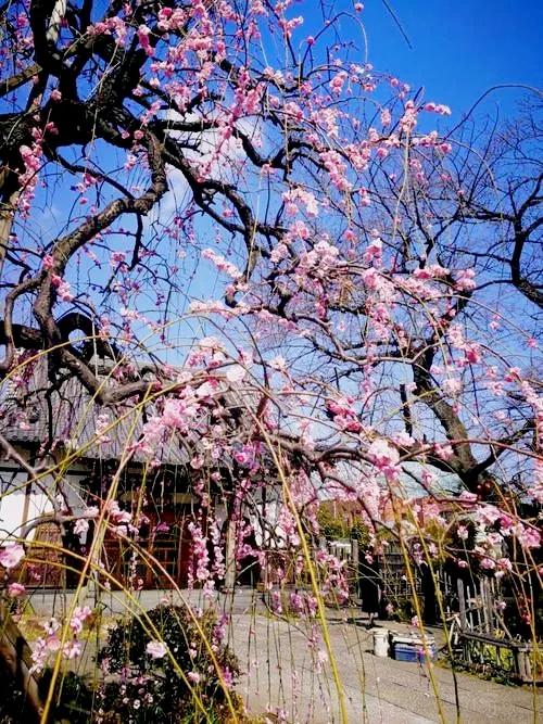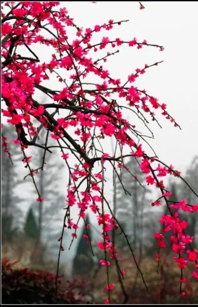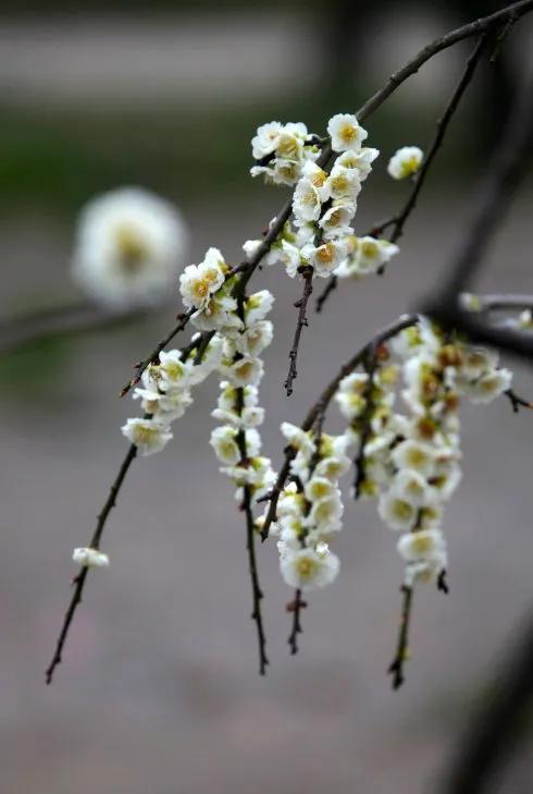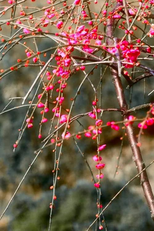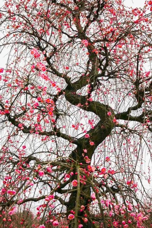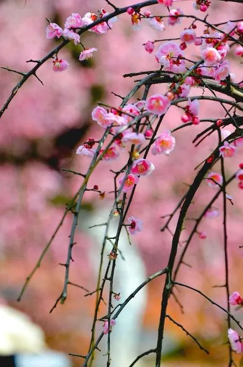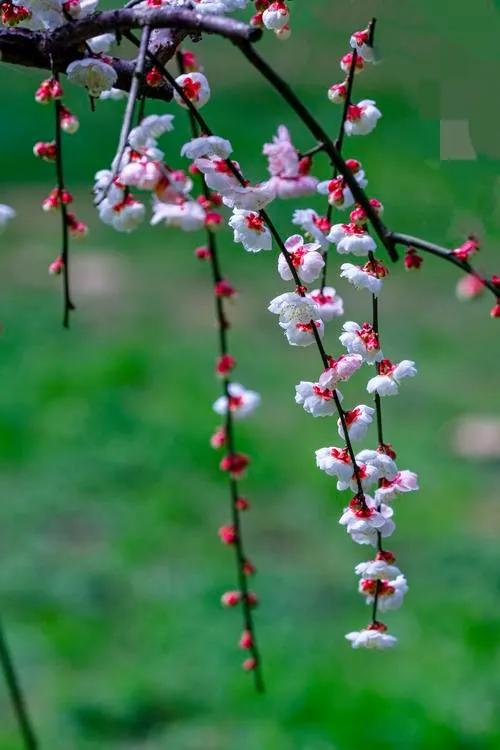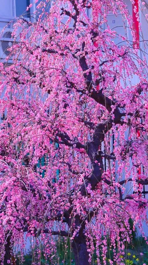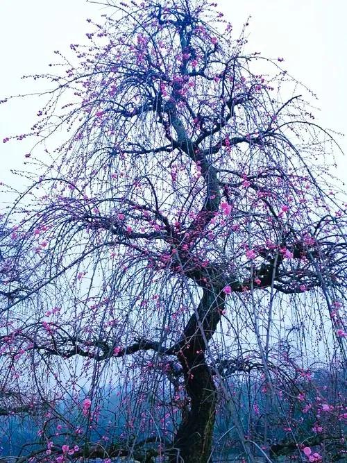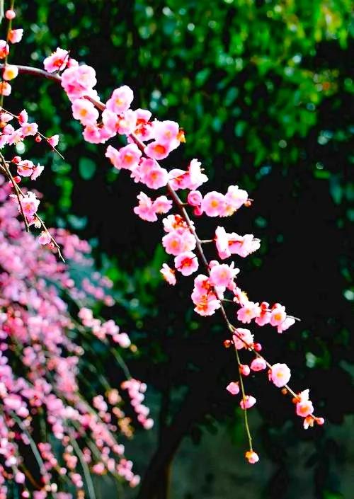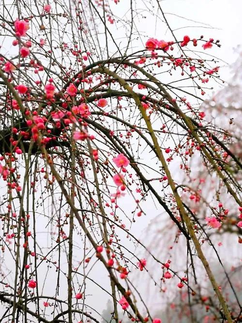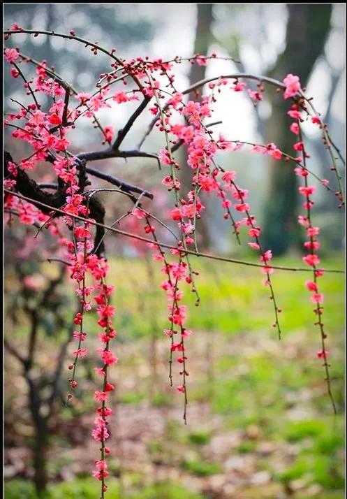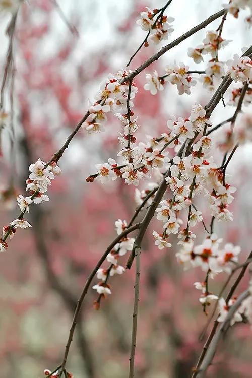 垂枝梅,因它的花枝自然下垂或斜垂而得名,花有红色、粉色、白色。垂枝梅和别的梅花最大的特点就是枝条向下生长,盛开期时就像梅花瀑布一样,花体量大,很是漂亮!