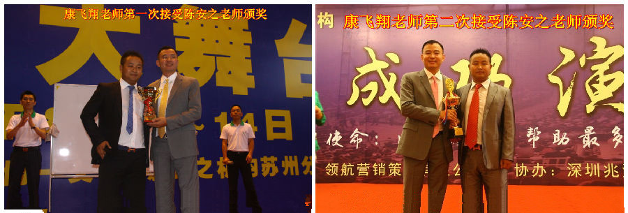 康飞翔老师连续三次蝉联陈安之机构全国销售总冠军,接受陈安之老师颁发冠军奖杯!