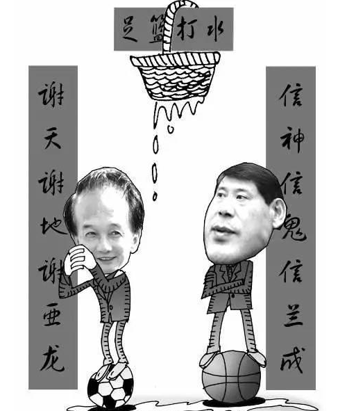 足协和篮协可谓是中国体育界的一对难兄难弟,民间有对联为证:上联为“谢天谢地谢亚龙”,下联是“信神信鬼信兰成”,横批“竹篮打水”。这是一个相当奇特的现象,也只有在中国这个国度里才存在。
