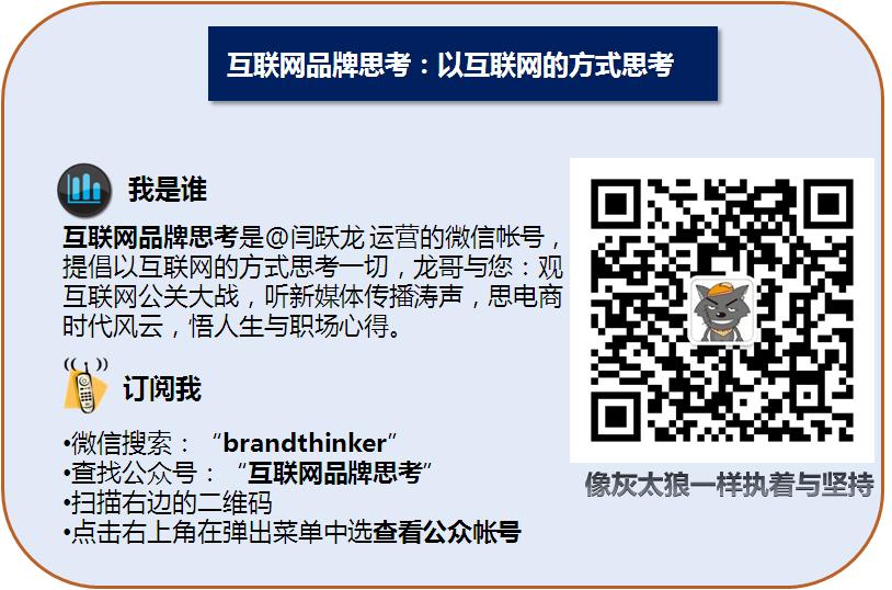 本篇文章来自龙哥运营的微信公众帐号『互联网品牌思考』,如果你觉得文章有价值,欢迎分享到朋友圈。