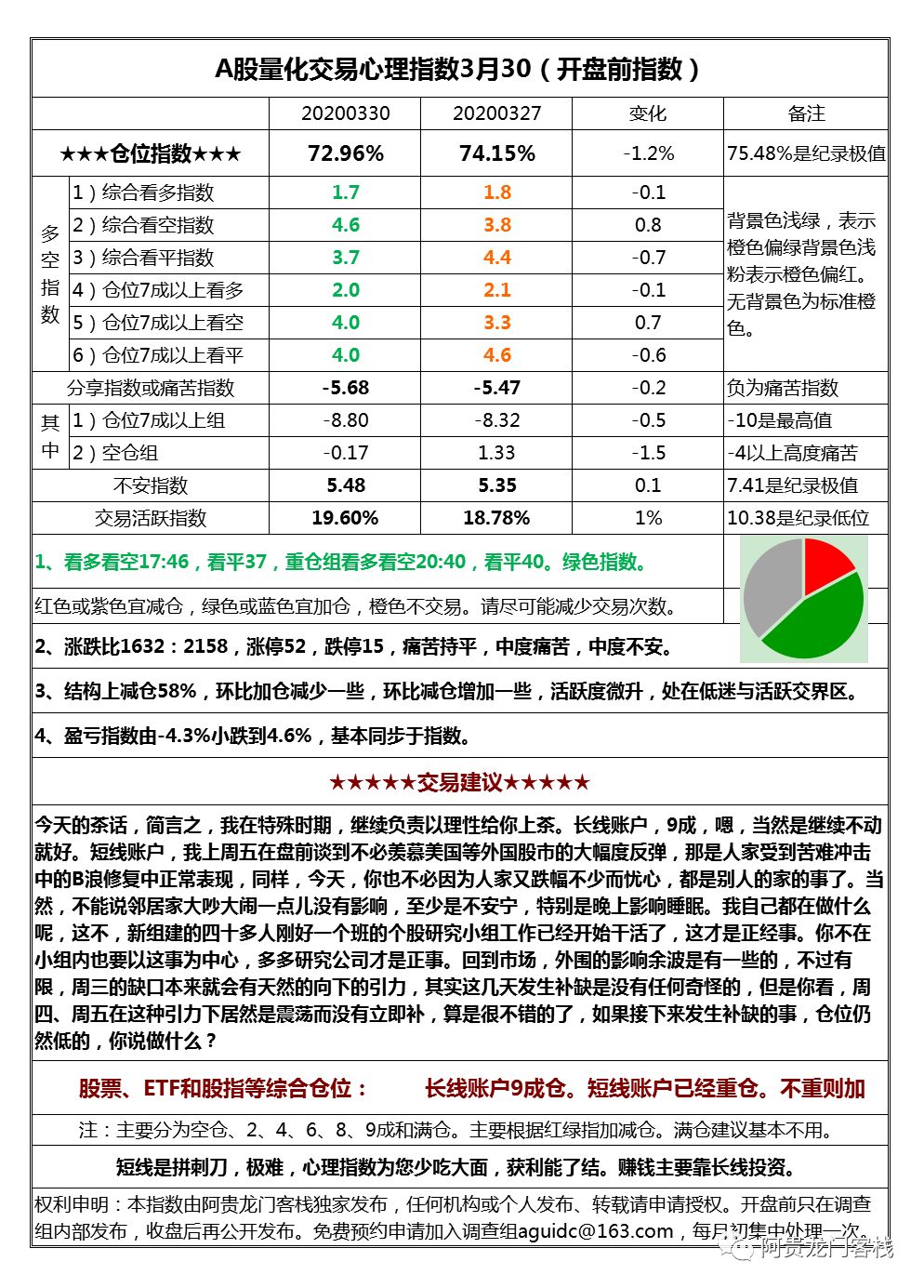 今天的茶话,简言之,我在特殊时期,继续负责以理性给你上茶。长线账户,9成,嗯,当然是继续不动就好。短线账户,我上周五在盘前谈到不必羡慕美国等外国股市的大幅度反弹,那是人家受到苦难冲击中的B浪修复中正常表现,同样,今天,你也不必因为人家又跌幅不少而忧心,都是别人的家的事了。当然,不能说邻居家大吵大闹一点儿没有影响,至少是不安宁,特别是晚上影响睡眠。我自己都在做什么呢,这不,新组建的四十多人刚好一个班的个股研究小组工作已经开始干活了,这才是正经事。你不在小组内也要以这事为中心,多多研究公司才是正事。回到市场,外围的影响余波是有一些的,不过有限,周三的缺口本来就会有天然的向下的引力,其实这几天发生补缺是没有任何奇怪的,但是你看,周四、周五在这种引力下居然是震荡而没有立即补,算是很不错的了,如果接下来发生补缺的事,仓位仍然低的,你说做什么?