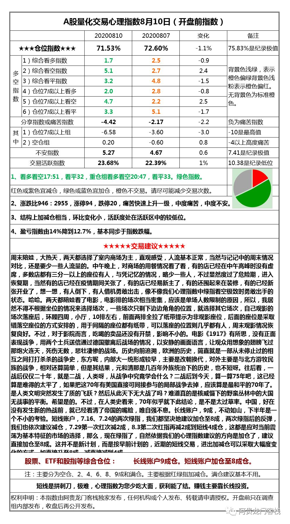 短线账户,7.16、7.24的两次绿指,我们都坚决地建议加仓至8成,两次绿指后的反弹,我们也依次建议减仓,7.29第一次红次减2成,8.3第二次红指再减2成到短线4成仓,这都是应对当前震荡为基本特征的市场的选择,那么,现在绿指了,自然依据我们的心理指数建议的方向是加仓了,建议直接加仓至8成。这并不是新计划,而是按早前计划的,近期的短线交易,进出加减仓可以采取大幅度变化的方式,加直接升至8成,减直接减到4成。