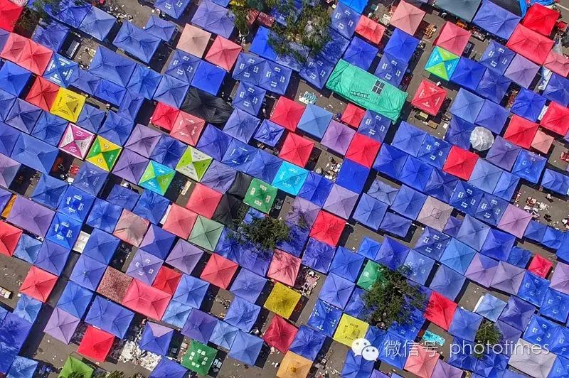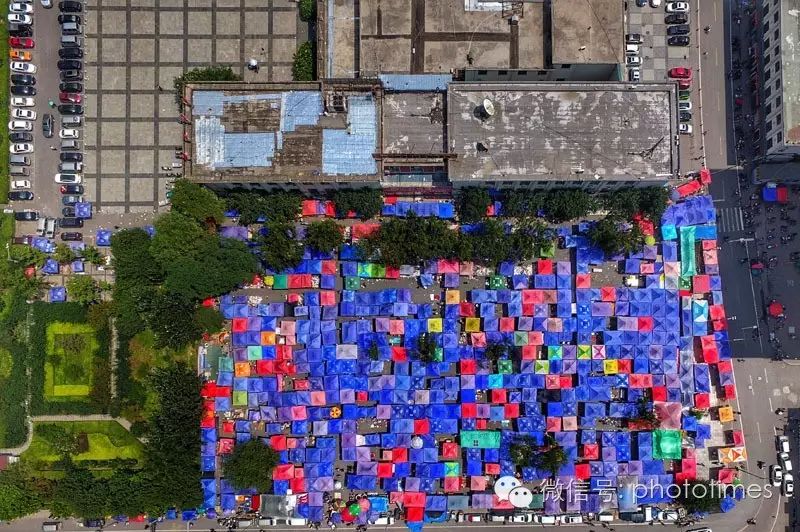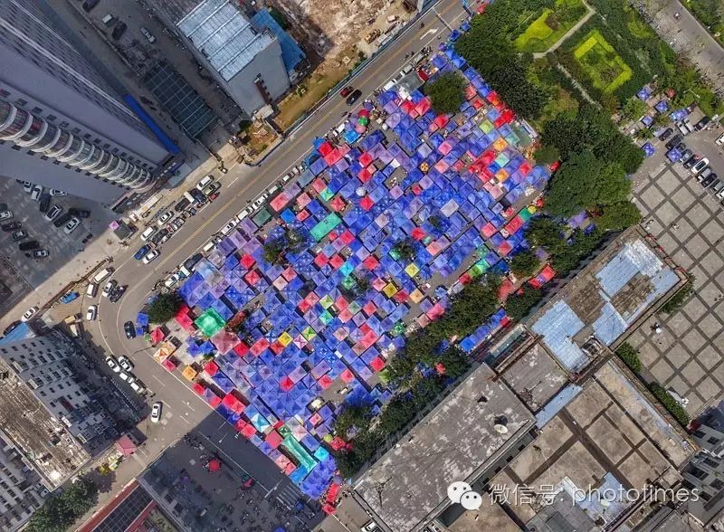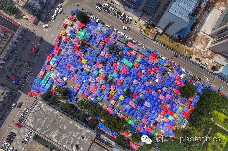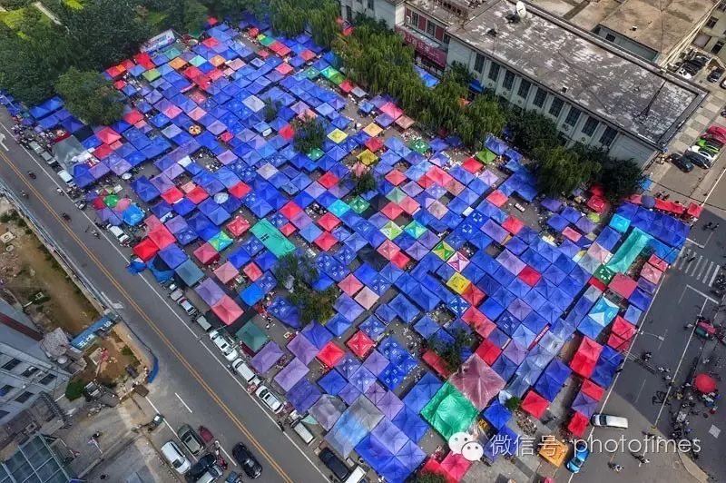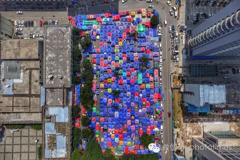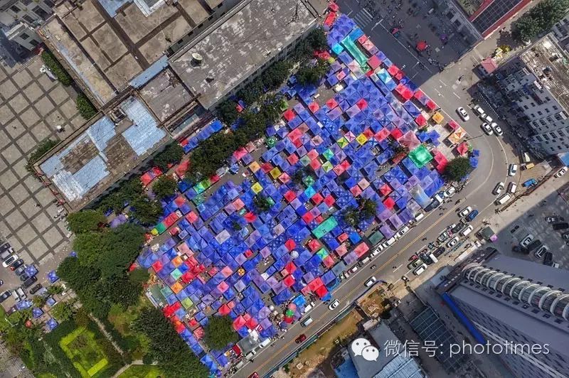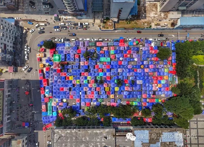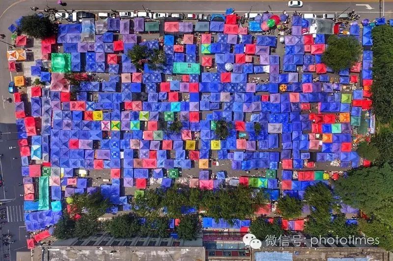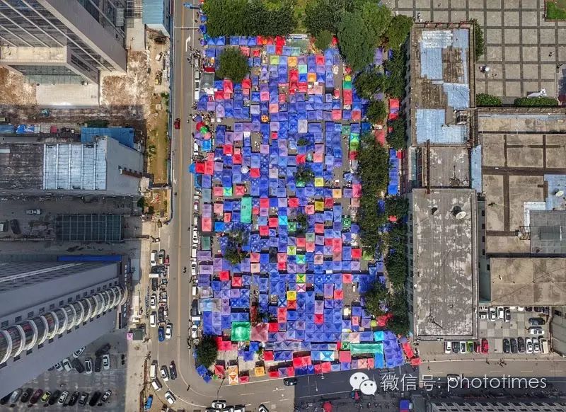 8月21日,山西太原南宫古玩市场,五百余家商户分别搭起遮阳帐篷躲避烈日炙烤。从高空俯看,这些密密麻麻的帐篷犹如经典游戏“俄罗斯方块”一般。