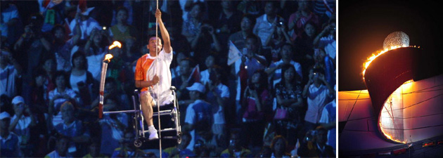 北京奥运会的开幕式点火形式让人意想不到,残奥会的点火方式更是让人意外。中国残奥史上首枚金牌获得者平娅丽在可爱的导盲犬的帮助下,将圣火传给了最后一棒火炬首是侯兵,侯兵坐在轮椅上,通过双手拉动绳索,将自己上升到火炬上空,点燃了圣火。他表达了残疾人对生命的抗争,表达了拼搏的精神。