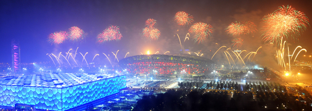七点五十九分,现场灯光熄灭,倒计时礼花在上空绽放,现场观众欢呼,来自五大洲的不同肤色的五个孩子,露出童真的面庞,将手中的倒计时牌分别打开,60……50……40……30……20,然后用焰火进行10秒倒计时,延续了奥运会开闭幕式的精彩。