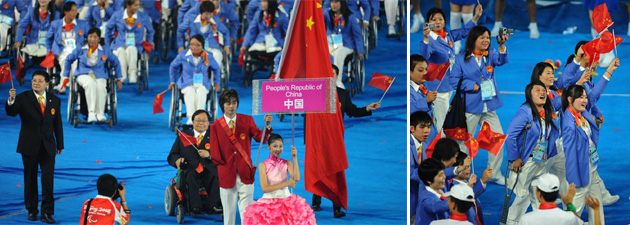 各个代表团按照国家中文壁画进场,他们用自己的坚强演绎了执着的信念,用自己坚强唱响了生命的赞歌,各国的旗手有各有不同,但都有一种叫做自豪的表情,都有一个共同的名字“你行,我也行”。