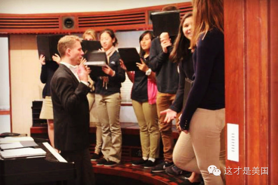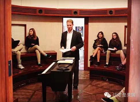 这是在上音乐课,有时候也可能会被用来上英国文学,讲莎士比亚的歌剧,所以房间被设计有成拢音效果的圆形,在里面会有在大的音乐厅的感受。