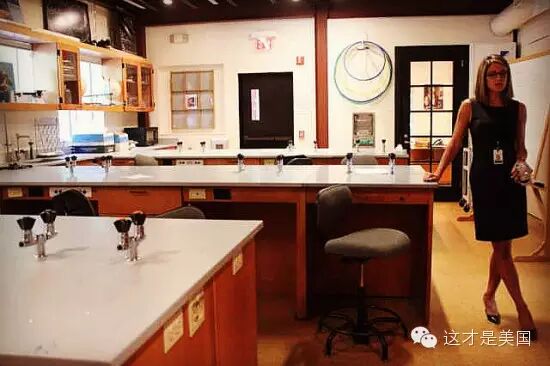 接待老师带我们参观化学实验教室,美国学生上化学课,经常是两个孩子一组,共同完成一项实验任务,所以你看这些凳子桌子,都是这样安排。